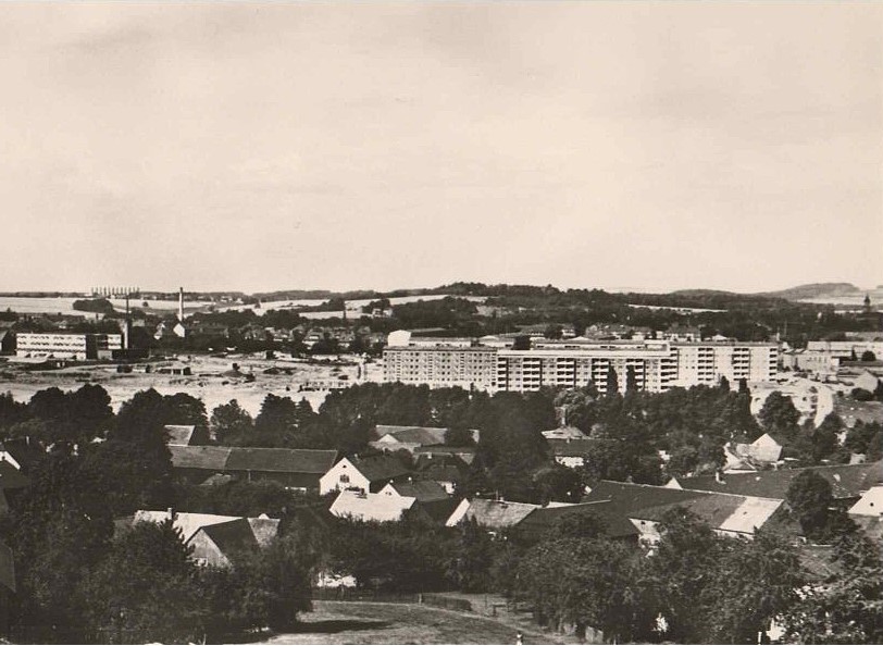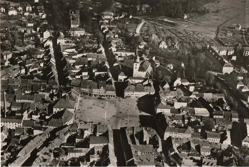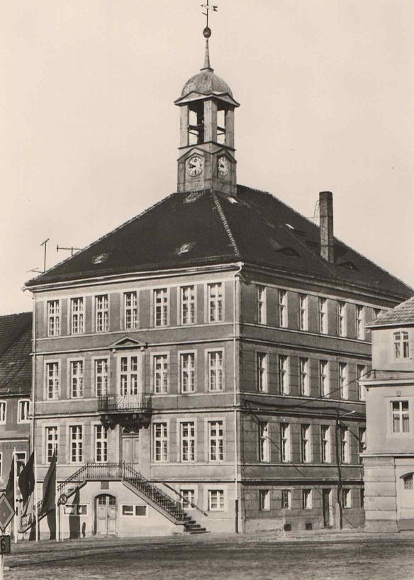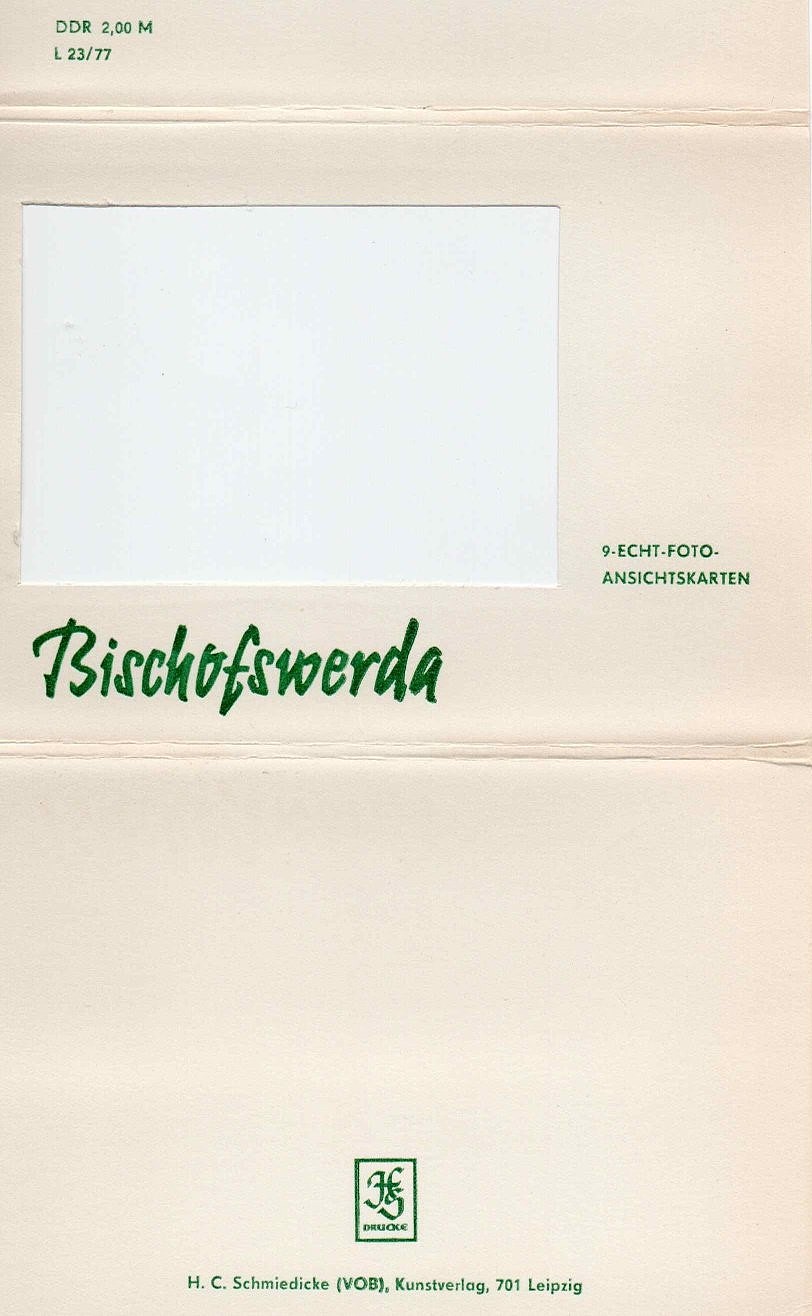 Historische Postkarten (Kulturhaus Bertolt Brecht, Luftbild Markt um 1945, Stadtansicht vom Napoleonstein, Alte Stadtmauer, Birkengasse 1977, Distanzsäule 1977, Rathaus 1977, Südvorstadt 1977, Fronfeste)